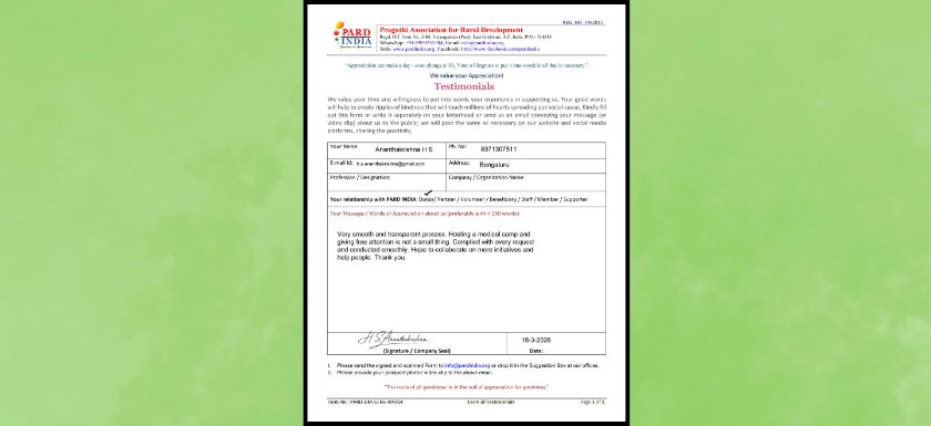 The entire process was very smooth and transparent. Organizing a medical camp and providing free healthcare services is truly commendable and not a small task. Every request was carefully considered, and the camp was conducted efficiently.